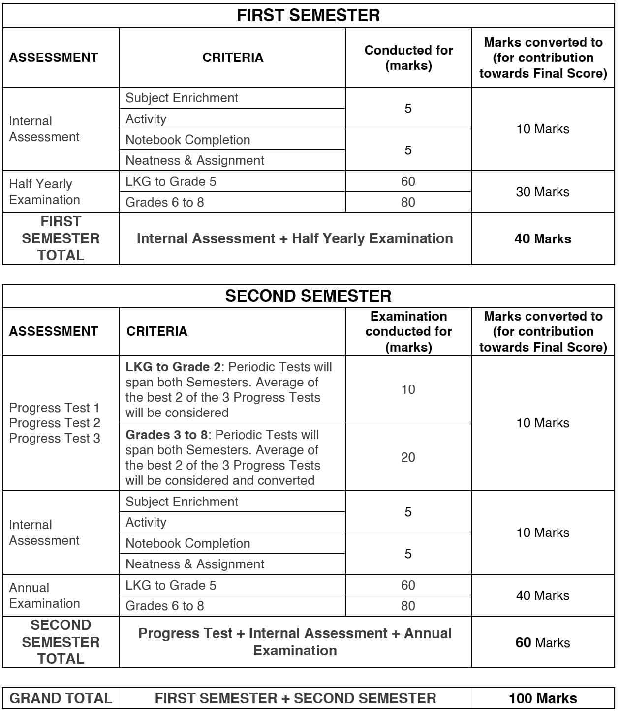It is compulsory for a student to appear for all examinations and tests. If a student fails to appear for the Half Yearly Examination (LKG to Grade 8) on genuine grounds and if the Principal is satisfied with the reasons, he/she may be allowed proportionate credit for the examination at the time of final assessment for promotion to the next higher grade.